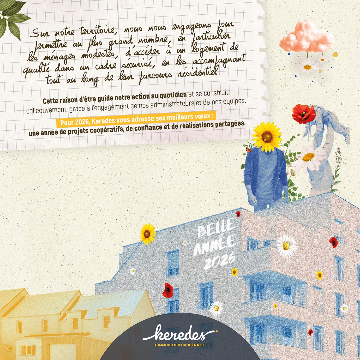 Nous avons conçu une carte de vœux imprimée pour Keredes, ainsi que sa déclinaison numérique, avec un style graphique volontairement marqué mêlant découpages, collages et textures autour de projets immobiliers réellement construits par la société à Rennes et en Bretagne. Le visuel associe bâtiments, silhouettes, éléments végétaux et typographies manuscrites pour créer une image dynamique et chaleureuse.